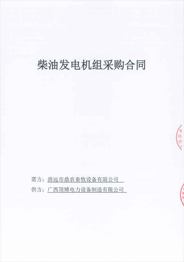 2020年12月31日,在這2020年的最后一天,廣西頂博電力設(shè)備制造有限公司再度傳來好消息,頂博電力與清遠(yuǎn)市鼎農(nóng)畜牧設(shè)備有限公司成功簽訂兩臺(tái)柴油發(fā)電機(jī)組,分別是50KW玉柴柴油發(fā)電機(jī)組一臺(tái)和100KW玉柴柴油發(fā)電機(jī)組一臺(tái)。