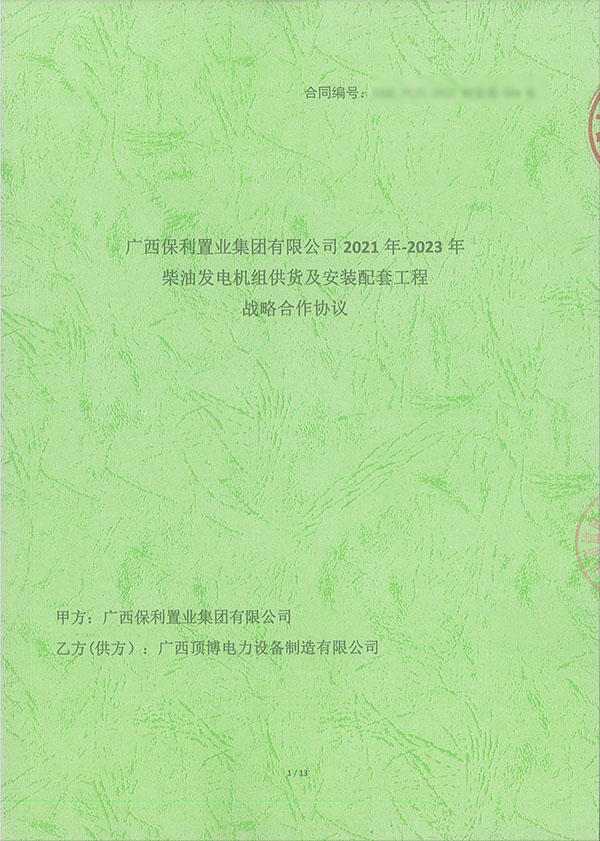 2021年7月26日,廣西頂博電力設(shè)備制造有限公司傳來(lái)喜訊,我公司成功與保利置業(yè)集團(tuán)成功簽訂2021年-2023年柴油發(fā)電機(jī)組供貨及安裝配套工程戰(zhàn)略合作協(xié)議,標(biāo)志著接下來(lái)的兩年時(shí)間內(nèi),作為戰(zhàn)略合作單位的保利集團(tuán)或其控股的各房地產(chǎn)公司或項(xiàng)目公司在建和即將開發(fā)項(xiàng)目的