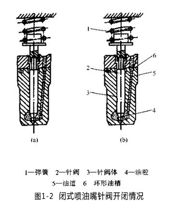 閉式噴油器的工作原理如1-2所示,來(lái)自噴油泵的高壓柴油經(jīng)噴油器體與針閥體內(nèi)的油道進(jìn)入油腔,由于噴孔被針閥關(guān)閉,腔內(nèi)柴油壓力便迅速上升。當(dāng)作用在針閥承壓錐面上的柴油壓力大于調(diào)壓彈簧的彈力時(shí),針閥便沿軸向升起,噴孔被打開(kāi),于是高壓柴油通過(guò)噴孔開(kāi)始噴入燃燒室。由于噴孔的節(jié)流作用,被噴出的柴油形成霧狀的細(xì)小顆粒,與空氣迅速開(kāi)成可燃混合氣。這一噴油過(guò)程一直延續(xù)到噴油泵停止供油,并在噴油器腔內(nèi)油壓低于調(diào)壓彈簧彈力時(shí),針閥在調(diào)壓彈簧作用下立即關(guān)閉噴孔,噴油才停止。