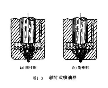 軸針式噴油器的特點(diǎn)是單孔,孔徑較大,一般為1~3mm。針閥端頭有一定形狀的銷針(軸針),插入噴孔中,與噴孔構(gòu)成一個(gè)很小的環(huán)狀間隙(約為0.013~0.025mm ),高壓柴油通過(guò)此間隙噴出。軸針的形狀有圓柱形和倒錐形,如圖1-3所示。噴出的柴油根據(jù)不同的軸針形狀產(chǎn)生不同的噴霧狀況。這種噴油器的優(yōu)點(diǎn)是:軸針在噴孔中上下運(yùn)動(dòng),既能改善噴霧,又能自行清除積炭,使噴孔不易堵塞,提高了柴油發(fā)電機(jī)組的工作可性。