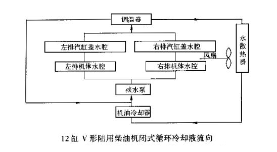 2、閉式循環(huán)冷卻系統(tǒng)。所謂閉式循環(huán)冷卻系統(tǒng),就是柴油發(fā)電機(jī)冷卻系統(tǒng)本身自成完整的封閉循環(huán)回路、陸用柴油機(jī)的閉式循環(huán)冷卻系統(tǒng)即從柴油機(jī)出來(lái)的高溫冷卻液,通過(guò)水散熱器靠風(fēng)扇強(qiáng)力鼓風(fēng)來(lái)冷卻,冷卻后的水再去冷卻柴油機(jī):閉式循環(huán)冷卻系統(tǒng),按機(jī)型和使用機(jī)油冷卻器的不同而有所不同,如下圖所示。